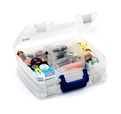 Dwustronne pudełka składające się z dwóch osobnych, łączących się ze sobą pudełek. Każde posiada osobną rączkę i regulowany, przy pomocy przegródek, środek.